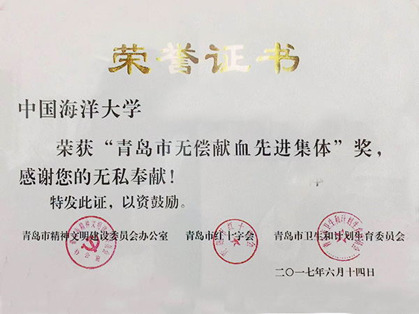 2017年6月,荣获“青岛市无偿献血先进集体”