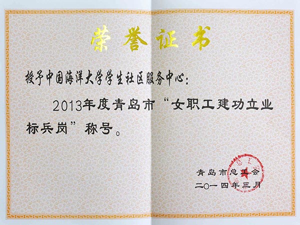 2014年3月,获得2013年度青岛市“女职工建功立业标兵岗”称号