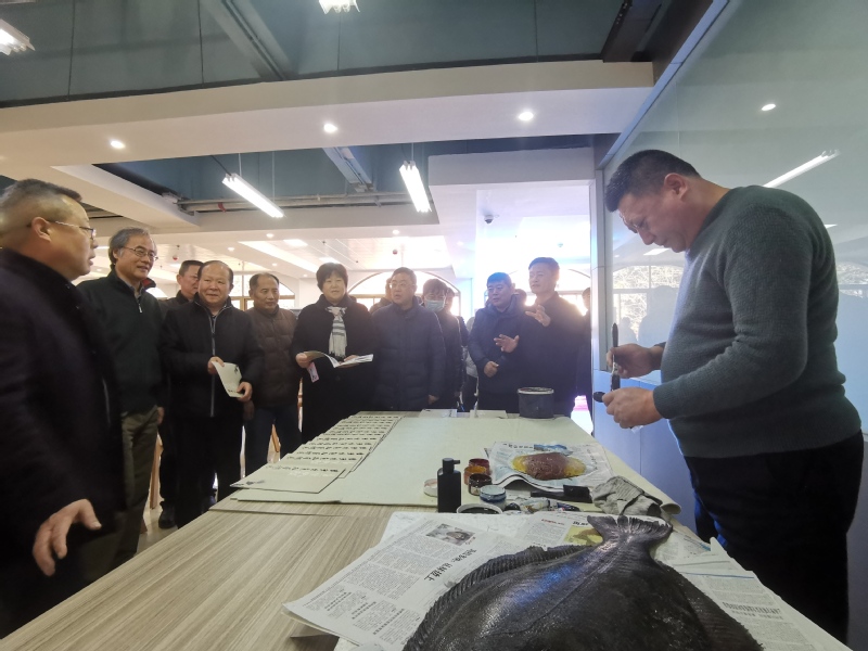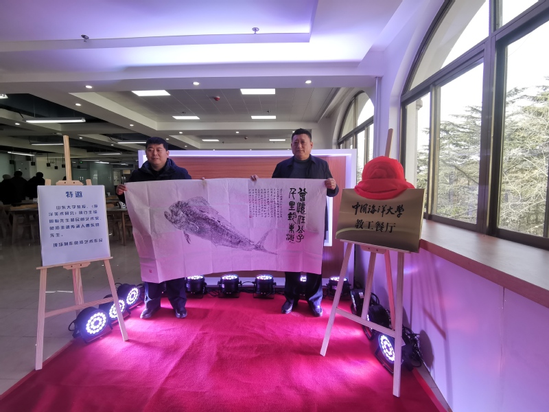 山东大学教授、《海洋美术研究》执行主编周怡先生和民间艺术家、鱼拓非遗传承人曹东晓受邀作鱼拓艺术展示并将作品赠与教工餐厅。