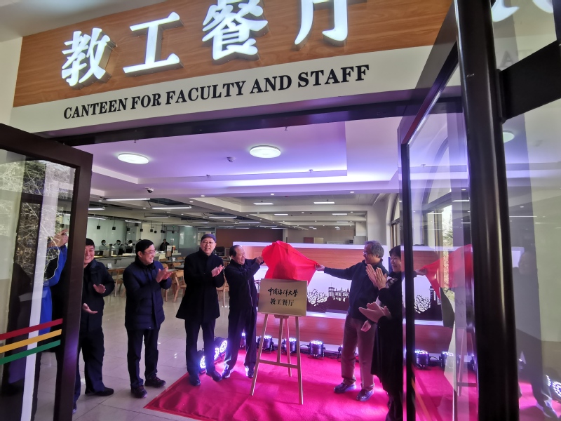 党委副书记卢光志(左四)和中国科学院院士宋微波(左五)为鱼山校区教工餐厅揭牌