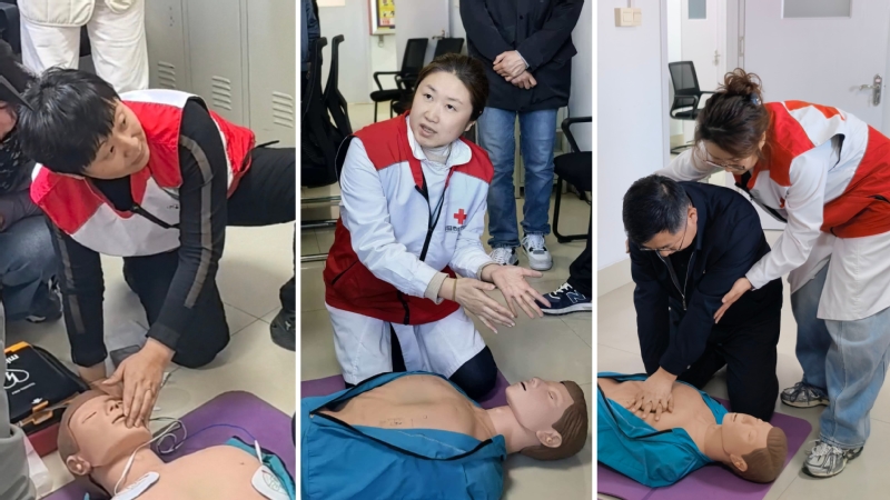 培训包括理论精讲、案例教学、理论知识测试与现场实操考核等环节。培训现场,张丽娜老师亲自示范、分步讲解了心肺复苏操作规范、自动体外除颤器(AED)使用方法、应急处置流程等关键内容;校医院医护人员全程协助开展实操教学和动作指导;参训人员认真聆听、积极上手,全员完成理论答题和心肺复苏、AED规范操作考核。经专业评定,考核合格者将获得由中国红十字会统一颁发的应急救护资格证书。
